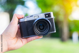 Soft focus photo of retro-style rangefinder camera. Black-and-gray camera on hand.