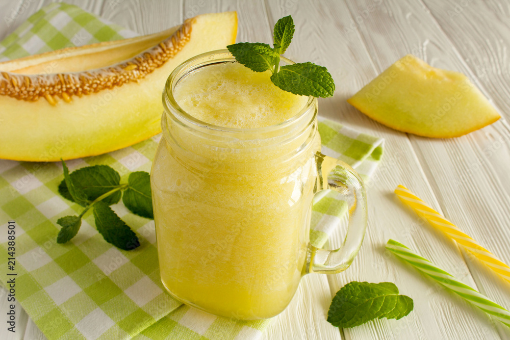 Smoothies from melon on the white wooden background