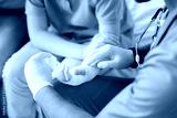 Treat me. Professional medical worker having special instrument and wearing sterile gloves while dressing injured hand of his patient