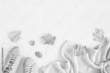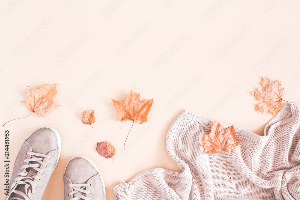 Women fashion clothes on pastel beige background. Sweater, sneakers, dried autumn leaves. Autumn, fall concept. Flat lay, top view