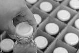 The hand picking a glass bottle with white bottle caps in a cardboard box, Packaging concept.