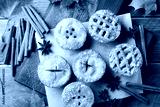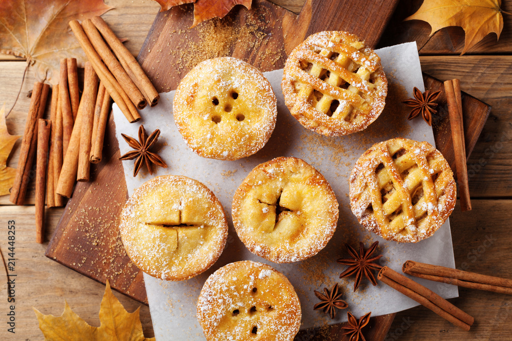 Set of different mini apple pies decorated sugar powder and cinnamon on wooden table top view. Autumn pastry dessert.