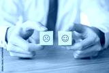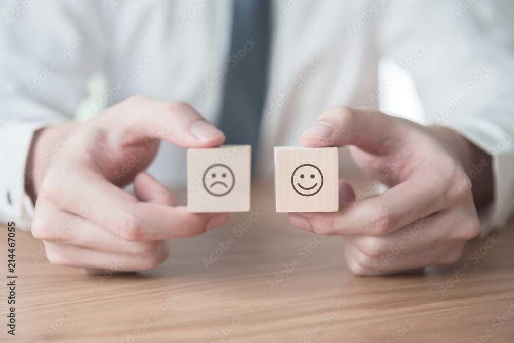 Close up smiley face icon and blurred sad on wood cube, Service rating, satisfaction concept.