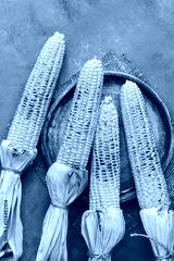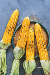 Roasted corn barbecue, gray background. View from above, flat lay.