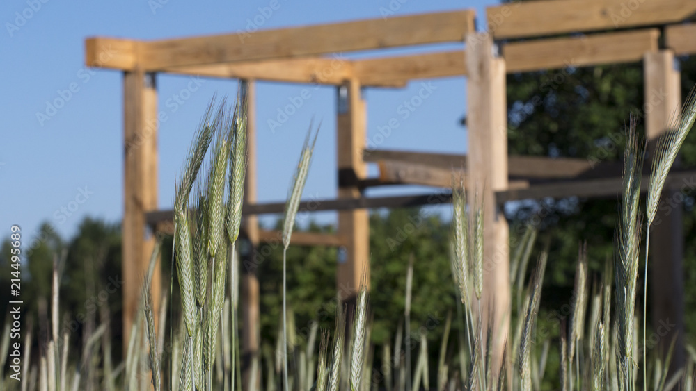 Skeleton wooden farm building / shed / garden storage next to the field. The development of a farm. Shrinking earth resources - building up agricultural areas