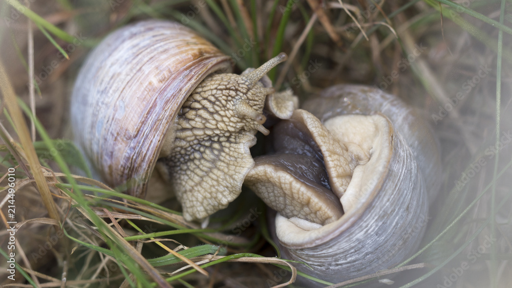 copulation of Roman snail / Burgundy snail / edible snail (Helix pomatia), close up