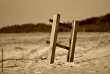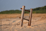 Drewniaana drabinka (płotek) na środku suchego, piaszczystego terenu, przysypana piaskiem, w rozmytym tle sucha trawiasta roślinność i zieleń, niebieskie niebo