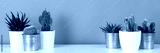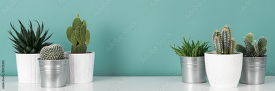 Modern room decoration. Collection of various potted cactus house plants on white shelf against pastel turquoise colored wall. Cactus plants banner.