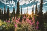 Lake on the summit of Mount Revelstoke sunset reflection sunstar across forest with blue sky and clouds. British Columbia Canada.