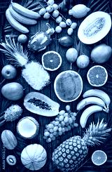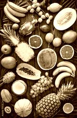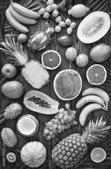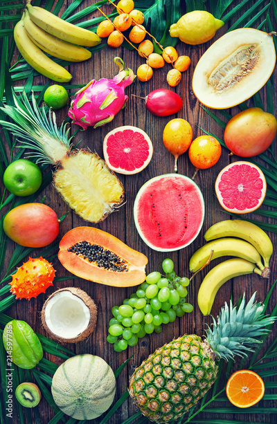 Assortment of tropical fruits with leaves of palm trees and exotic plants on dark wooden background