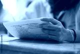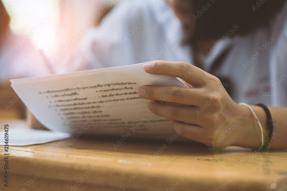 Close up Students writing and reading exam answer sheets exercises in classroom of school with stress.