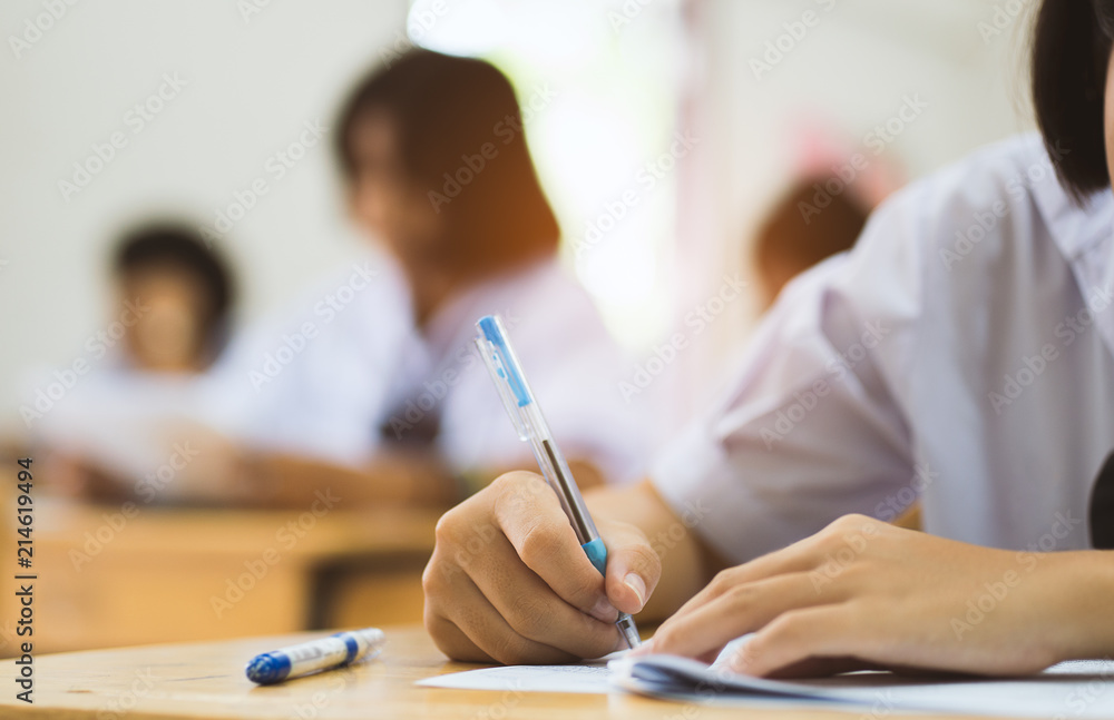 Close up Students writing and reading exam answer sheets exercises in classroom of school with stress.
