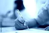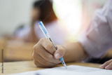 Close up Students writing and reading exam answer sheets exercises in classroom of school with stress.