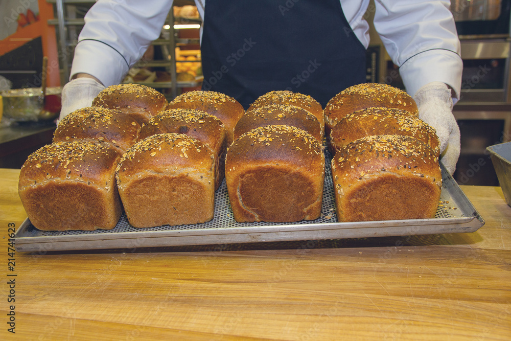 Baker's hands took the bread from the oven. Bakery
