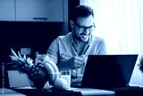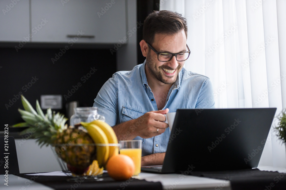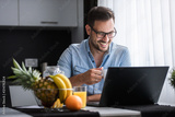 Handsome man using laptop computer at home, drinking juice and coffee in the morning. Working From Home.