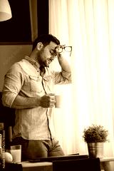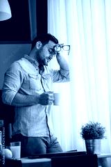 Tired man drinking coffee in the morning looking through window. Sleep disorder