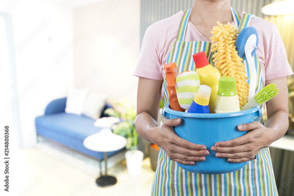 woman with cleaning equipment ready to clean house on living room