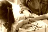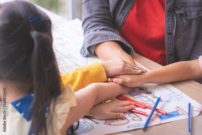 Teacher and kindergarten students hand together for teamwork