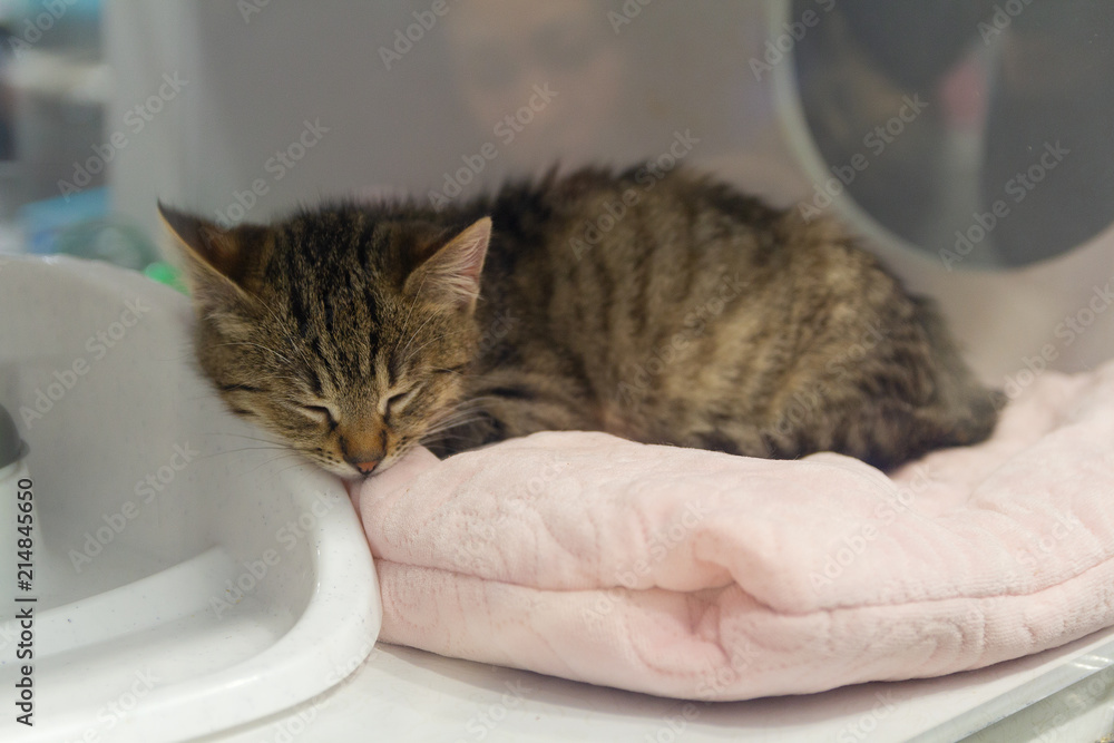 homeless white kitten is sleeping in a shelter behind a glass. Pets