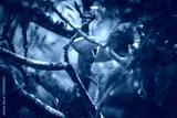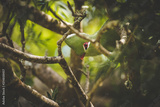 Close up image of a Knysna Turaco / Lourie feeding on the seeds of a Yellowwood tree in the Knysna forest in south africa