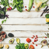 Healthy raw summer vegan ingredients. Flat-lay of colorful vegetables and greens on white table background, top view, copy space, square crop. Clean eating, dietingm vegan, vegetarian party food