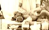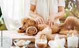 Woman giving body massage to a dog. Spa still life with aromatic candles, flowers and towel.