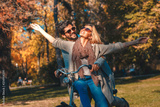 Happy young couple having fun riding a bicycle on sunny day in the park.