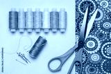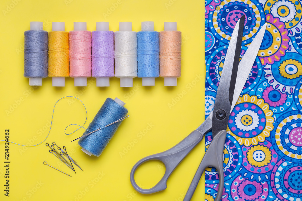 Still life with accessories for needlework. Bright fabric, scissors, pins, threads on reels.