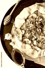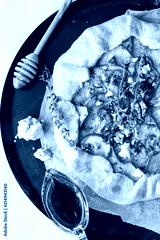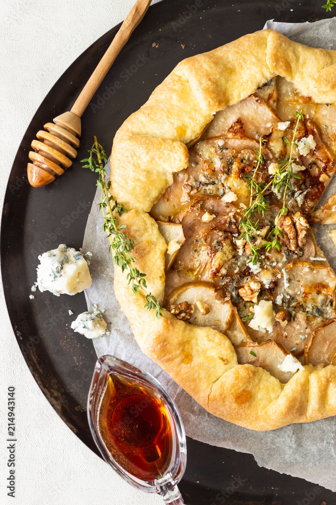 Homemade rustic galette with pears, blue cheese, walnuts and honey on light background. Gallette with a buttery crust and sweet fruit filling. Rustic style.