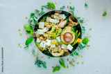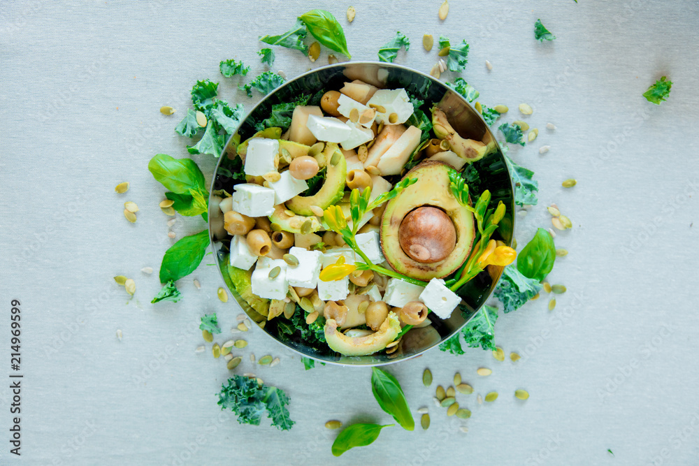 Salat with pear, cabbage, cheese, olive oil, avocado and herbs