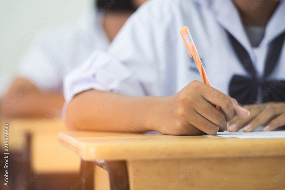 Hand of students in high school uniform holding pen writing on paper answer sheet taking final exam in classroom with stress.
