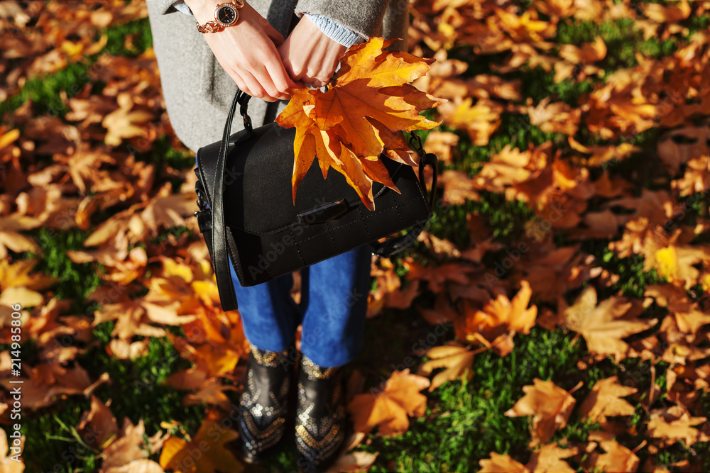 Fashion details: woman wearing autumn clothes and boots holding black leather bag and yellow leaves in her hands. Copy, empty space for text