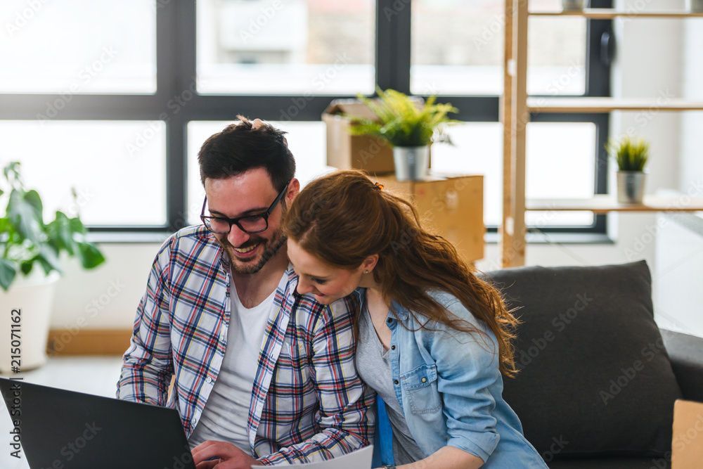 Young couple moving in new home. Sitting and relaxing after unpacking. Searching home decorating ideas on laptop