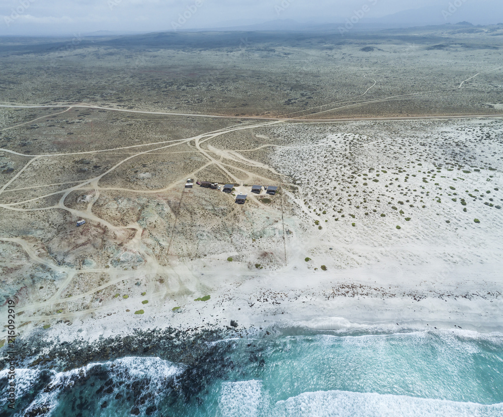 Punta de Choros at Atacama Desert amazing wild beaches. An aerial view of the Pacific Ocean crashing the land at Atacama sands, Chile