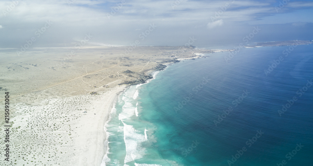 Punta de Choros at Atacama Desert amazing wild beaches. An aerial view of the Pacific Ocean crashing the land at Atacama sands, Chile