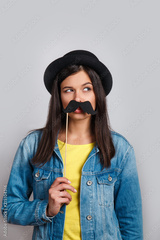 Celebration and party. Having fun. pretty woman in hat is laughing. Girl wearing fake mustaches.