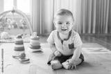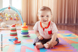 Portrait of cute adorable blond Caucasian smiling child boy with blue eyes sitting on floor in kids children room. Little baby playing with toys on playmat at home. Early education development concept