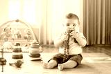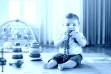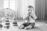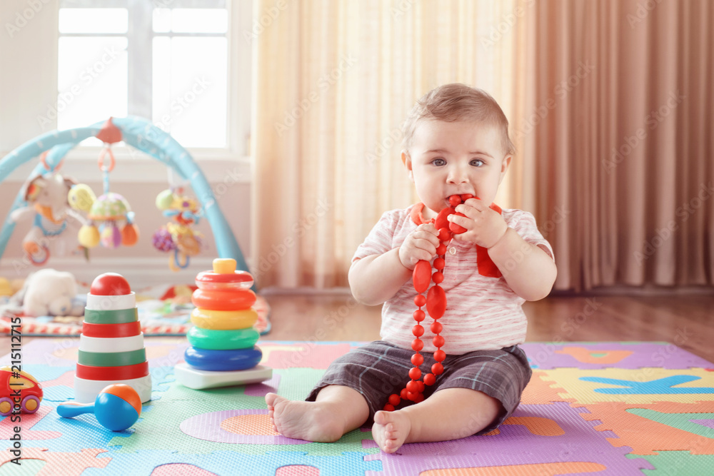 Portrait of cute adorable blond Caucasian smiling child boy with blue eyes sitting on floor in kids children room. Little baby playing with teething toys jewelry. Early education development concept.