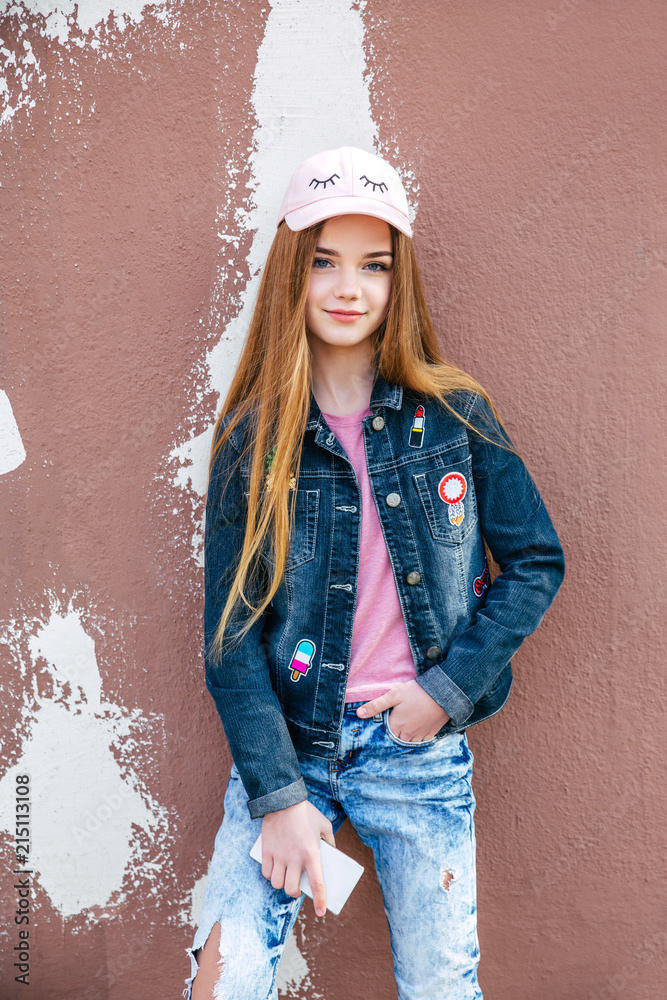 Portrait closeup beautiful young girl in city. Smiling girl in hat with smartphone