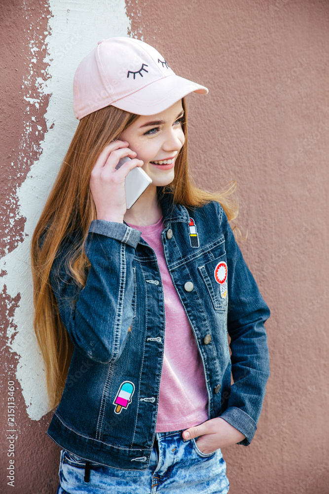 Portrait closeup beautiful young girl in city. Smiling girl in hat with smartphone