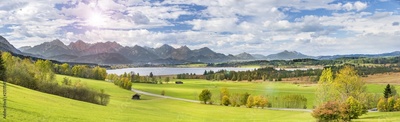 Panorama Landschaft mit Berge am Forggensee im Allgäu in Bayern