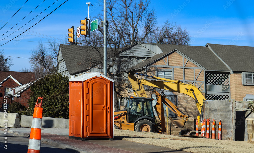 Portable bathroom at construction site at intersectio of urban roads with backhoe in background and traffic cones around