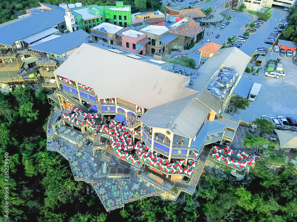 Aerial view restaurant with colorful umbrella decoration desk near bluffs cliff rock wall in America