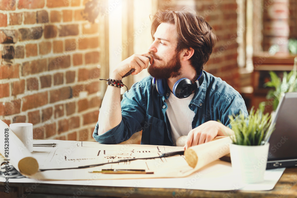 Concentrated young architect lookingto the window and thinking about new blueprint while sitting with laptop in a loft sunny office