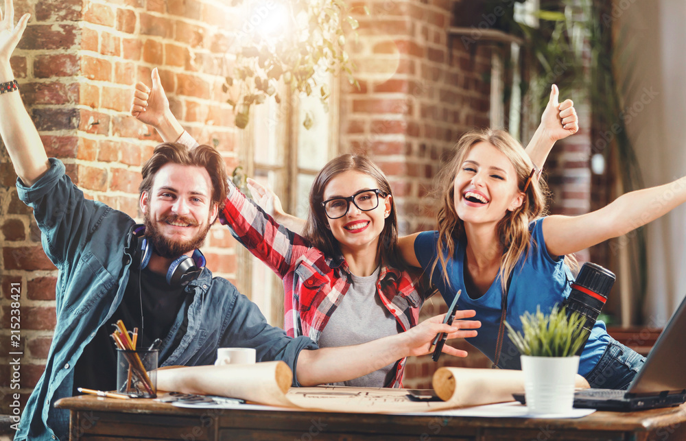 Happy young professional architects smiling to the camera during meeting in the loft modern office