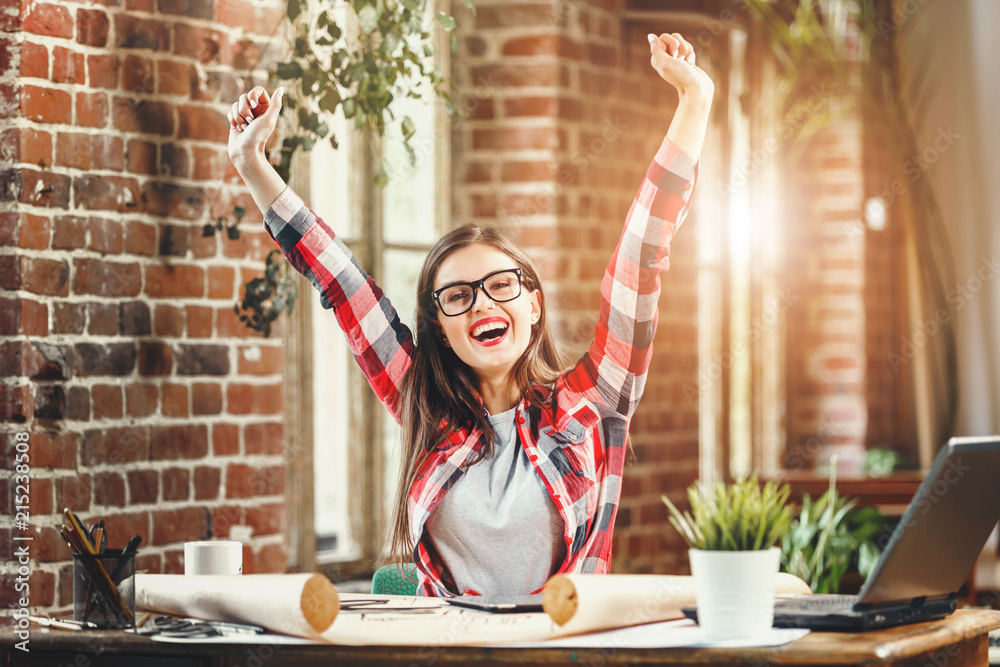 Young pretty long-hair woman architect holding hands up and smiling in the loft modern office