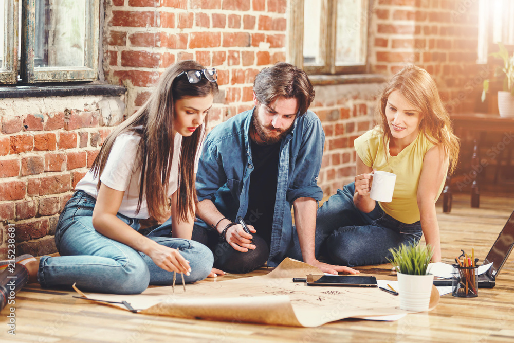 Crew of young professional architects discussing blueprint on the floor in the loft modern office