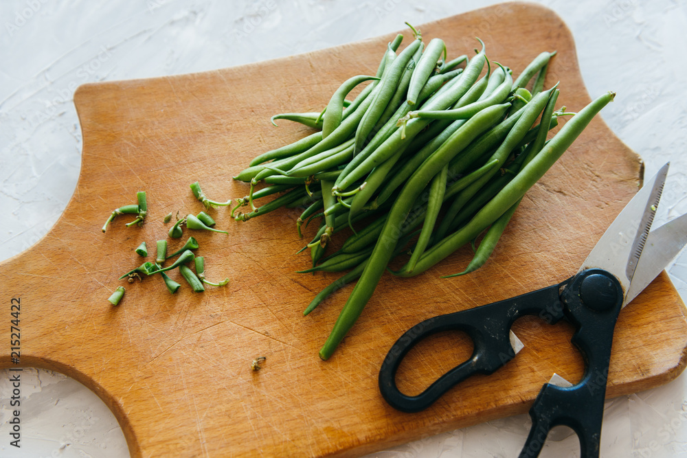 Green Beans on a grey concrete background wooden board cutting with scissors