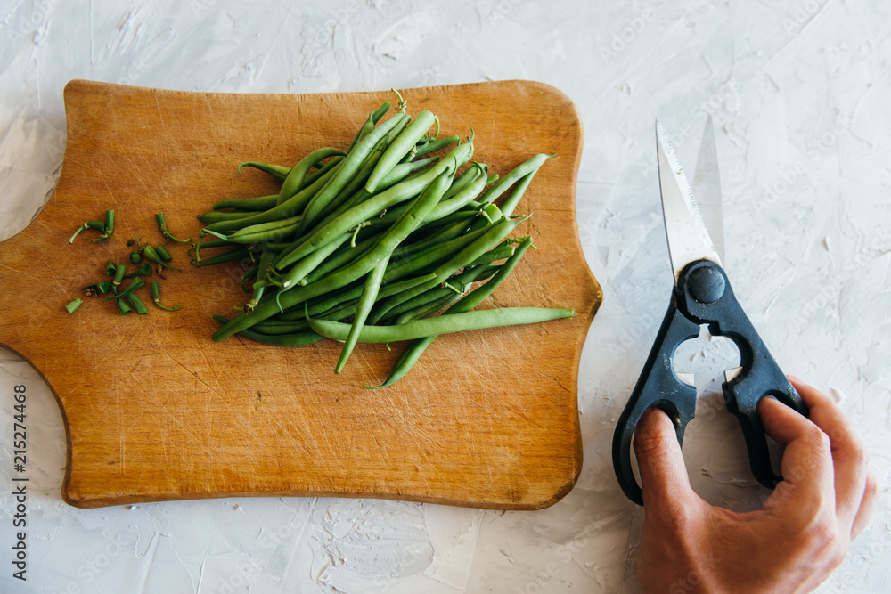Green Beans on a grey concrete background wooden board cutting with scissors