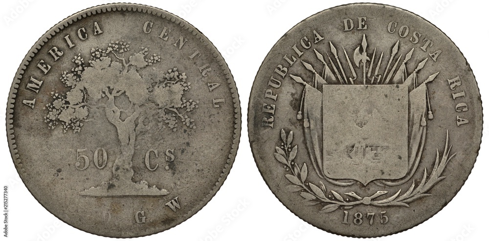 Costa Rica silver coin 50 fifty centavo 1875, tree divides face value, coat of arms, sailing ship and mountains, crossed halberds, rifles and flags behind,